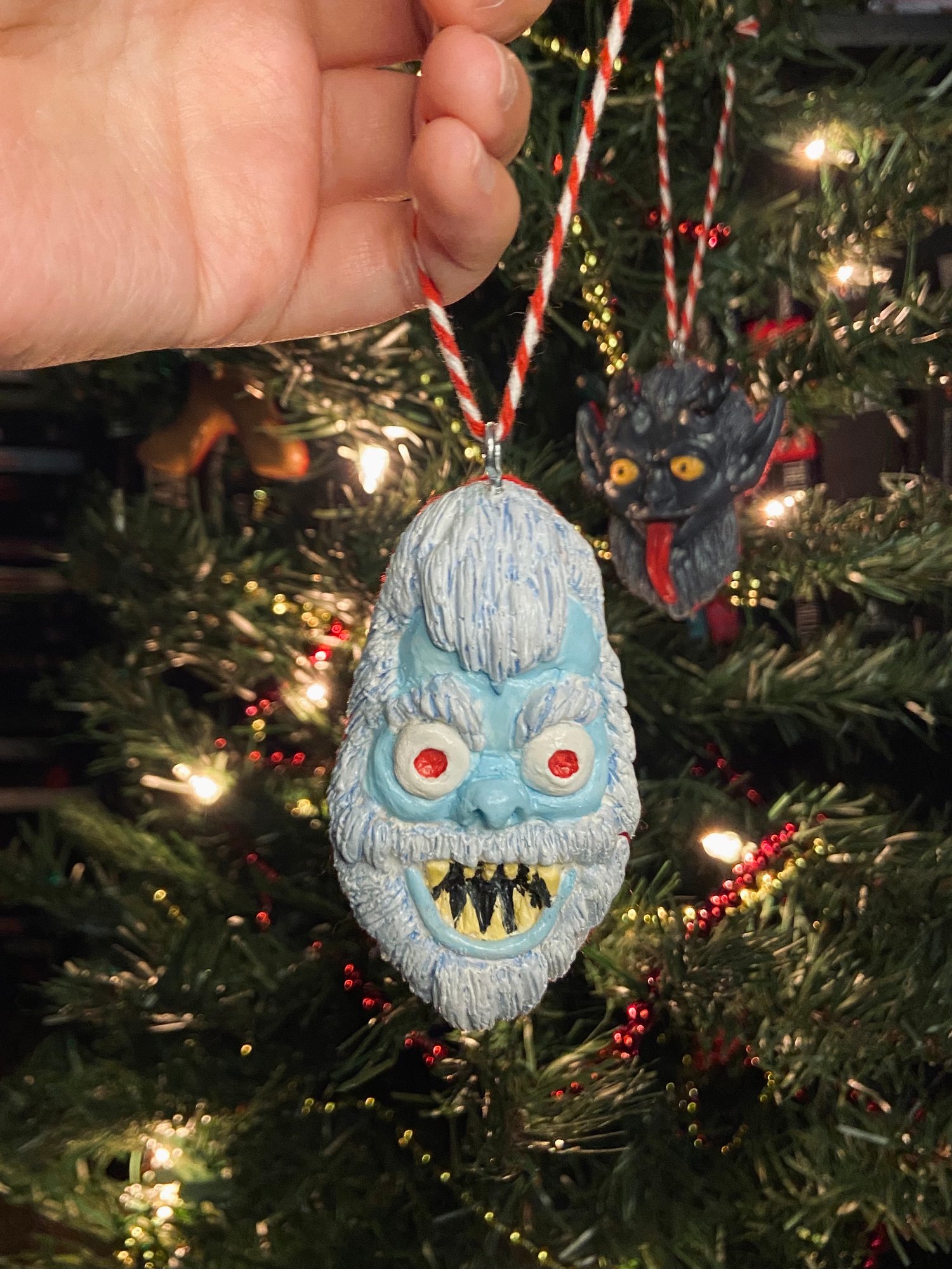 The abominable snow beast is a vicious reminder that there are worse aspects of the winter than the cold! Made of resin, this little guy is solid, but light enough to hang from a Christmas tree branch. It has a red felt backing, and candy cane colored string to add to the holiday spirit.
