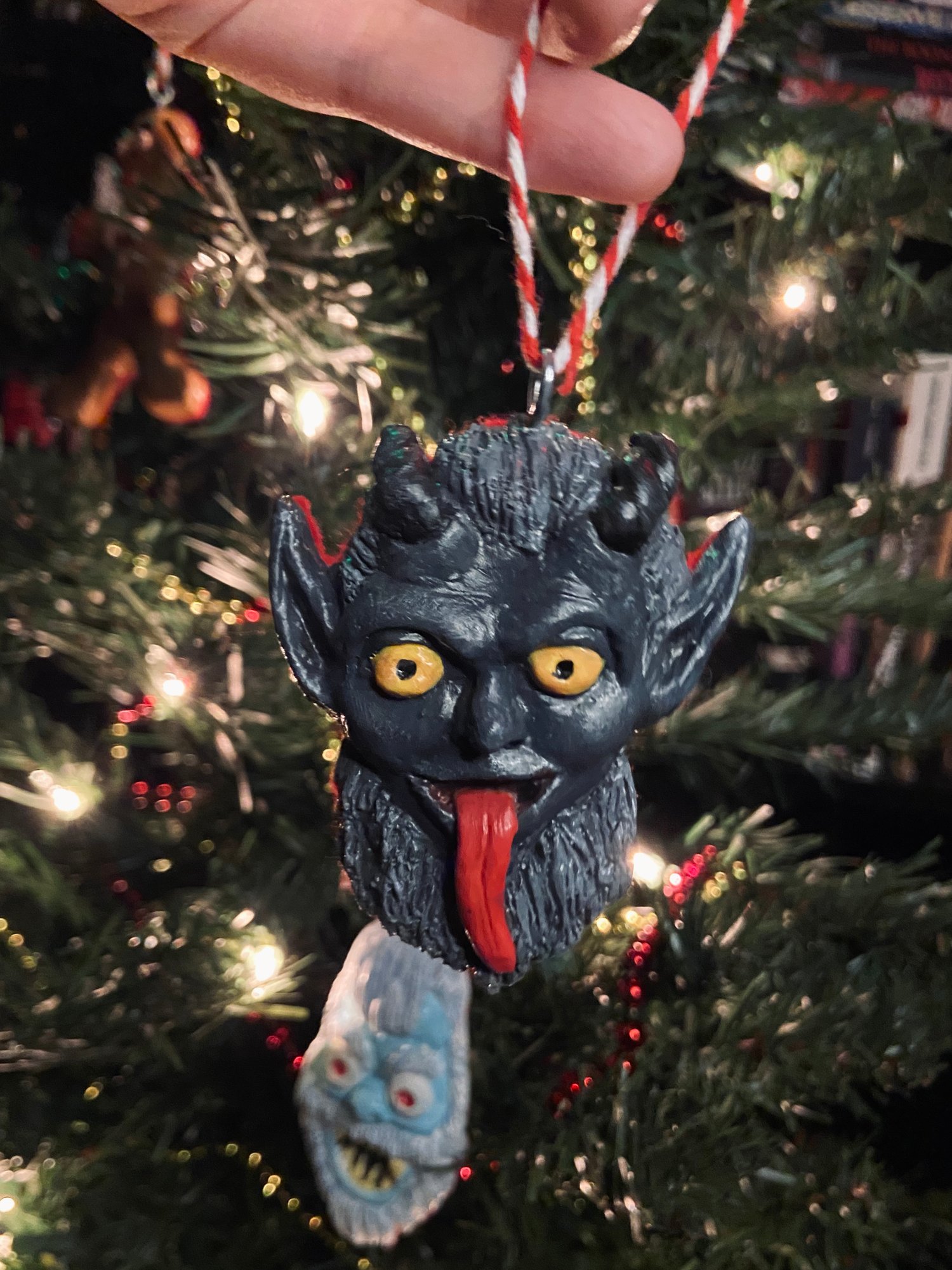 Children, beware! Seriously sinister compared to Santa, Krampus isn't just putting kids on his naughty list! Made of resin, this little guy is solid, but light enough to hang from a Christmas tree branch. It has a red felt backing, and candy cane colored string to add to the holiday spirit.